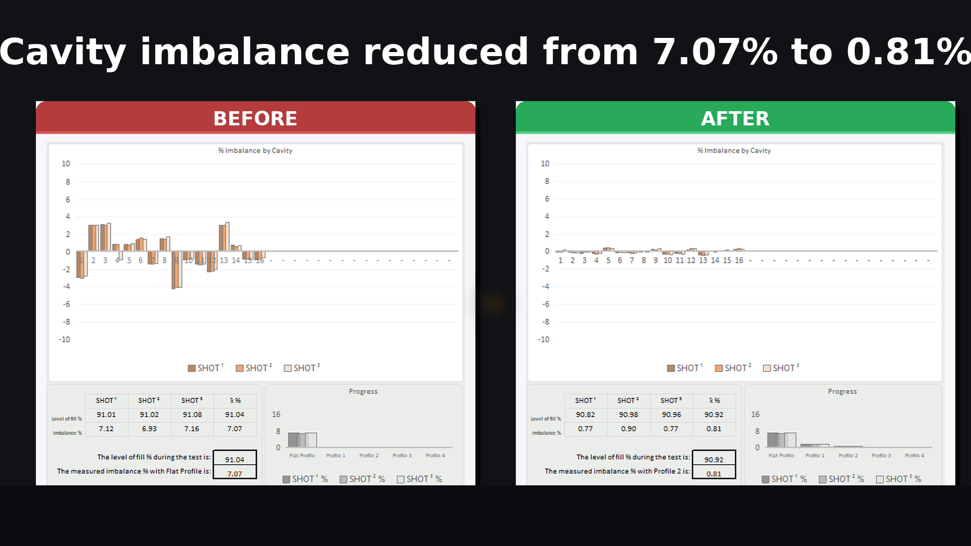 Cav-Bal® can achieve a measurable <1% cavity imbalance on your hot runner moulds; results are limited only by the resolution of the hot runner controller.